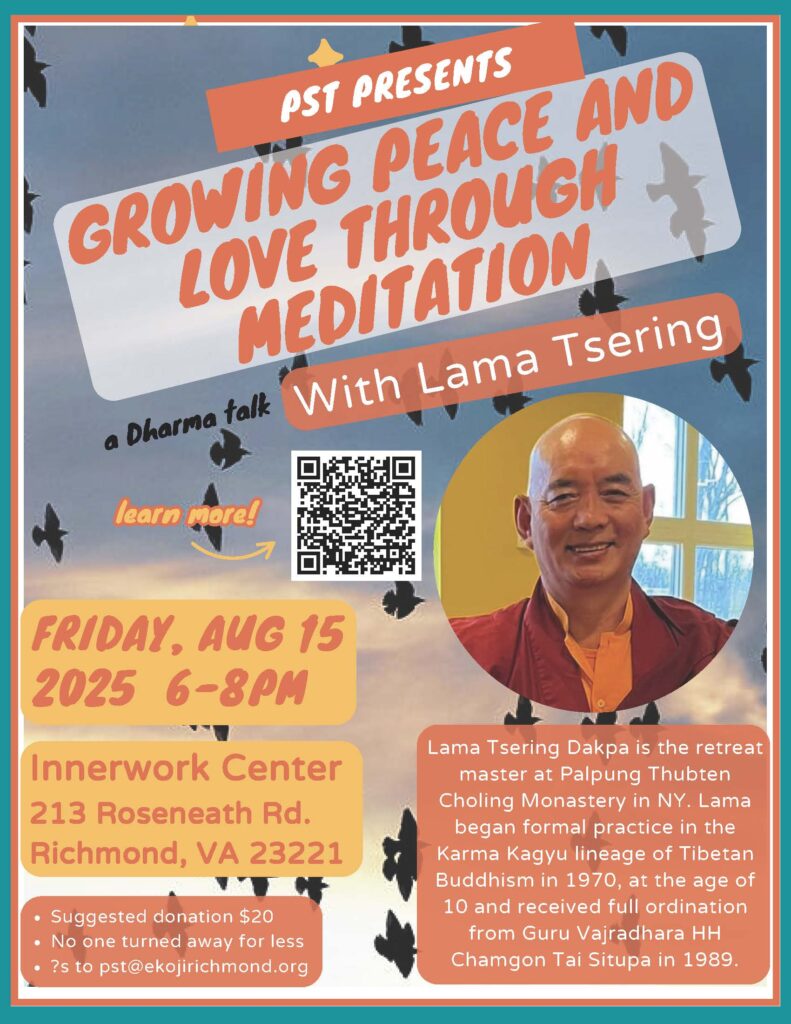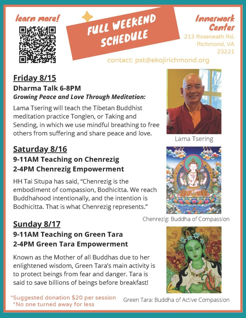 Lama Tsering Dakpa of Palpung Thubten Choling monastery will visit Richmond to give teachings and two empowerments: Chenrezig and Green Tara. All events will be in person at the Innerwork Center, 213 Roseneath Road, Richmond, Virginia 23221 — kitty-corner from Ekoji Buddhist Sangha. No advance registration is necessary. Friday evening, Saturday morning and Sunday morning sessions will also be available via Zoom link. (Saturday and Sunday afternoons are in-person only.) Please consider a donation toward expenses (see below).